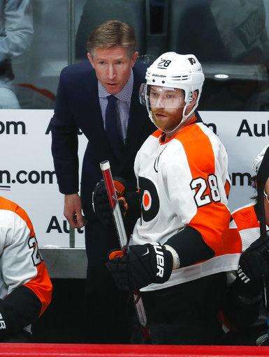 Philadelphia Flyers coach Ron Hakstol, left, confers with center Claude Giroux during the first period of the team's NHL hockey game against the Colorado Avalanche on Wednesday, March 28, 2018, in Denver. (AP Photo/David Zalubowski) The Associated Press