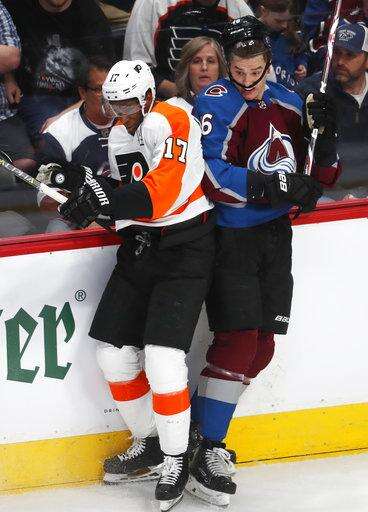 Philadelphia Flyers right wing Wayne Simmonds, left, checks Colorado Avalanche defenseman Nikita Zadorov during the first period of an NHL hockey game Wednesday, March 28, 2018, in Denver. (AP Photo/David Zalubowski) The Associated Press