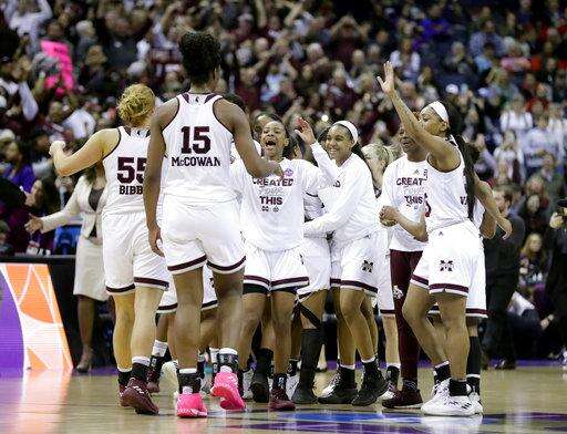 Members of Mississippi State celebrate after defeating Louisville in the semifinals of the women's NCAA Final Four college basketball tournament, Friday, March 30, 2018, in Columbus, Ohio. Mississippi State won 73-63 in overtime. (AP Photo/Ron Schwane)