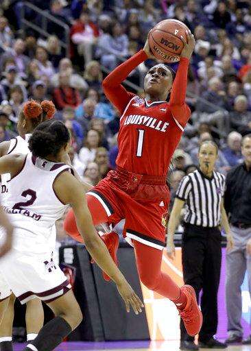 Louisville's Dana Evans (1) shoots over Mississippi State's Morgan William (2) during the second half in the semifinals of the women's NCAA Final Four college basketball tournament, Friday, March 30, 2018, in Columbus, Ohio. (AP Photo/Ron Schwane)