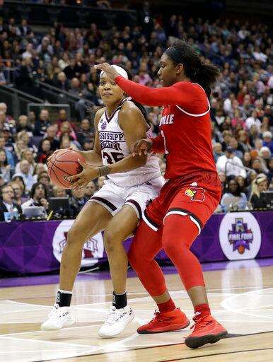 Mississippi State's Victoria Vivians (35) is defended by Louisville's Myisha Hines-Allen (2) during the second half in the semifinals of the women's NCAA Final Four college basketball tournament, Friday, March 30, 2018, in Columbus, Ohio. (AP Photo/Tony Dejak)