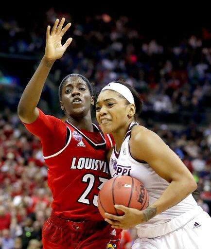 Mississippi State's Victoria Vivians, right, heads to the basket past Louisville's Jazmine Jones (23) during the second half in the semifinals of the women's NCAA Final Four college basketball tournament, Friday, March 30, 2018, in Columbus, Ohio. (AP Photo/Tony Dejak)