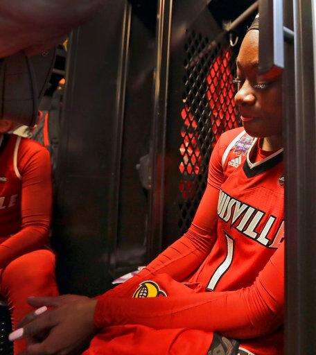 Louisville's Dana Evans sits in the locker room following a 73-63 loss to Mississippi State in the semifinals of the women's NCAA Final Four college basketball tournament, Friday, March 30, 2018, in Columbus, Ohio. (AP Photo/Tony Dejak)