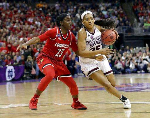 Mississippi State's Teaira McCowan, left, goes to the basket against Louisville's Myisha Hines-Allen (2) during overtime in the semifinals of the women's NCAA Final Four college basketball tournament, Friday, March 30, 2018, in Columbus, Ohio. (AP Photo/Tony Dejak)