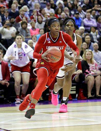 Louisville's Myisha Hines-Allen, front, goes to the basket past Mississippi State's Teaira McCowan during the second half in the semifinals of the women's NCAA Final Four college basketball tournament, Friday, March 30, 2018, in Columbus, Ohio. (AP Photo/Ron Schwane)