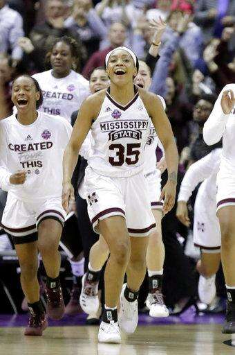 Mississippi State's Victoria Vivians celebrates with her teammates after defeating Louisville in the semifinals of the women's NCAA Final Four college basketball tournament, Friday, March 30, 2018, in Columbus, Ohio. Mississippi State won 73-63 in overtime. (AP Photo/Ron Schwane)