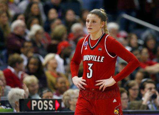 Louisville's Sam Fuehring walks to the bench after fouling out during the second half against Mississippi State in the semifinals of the women's NCAA Final Four college basketball tournament, Friday, March 30, 2018, in Columbus, Ohio. (AP Photo/Ron Schwane)