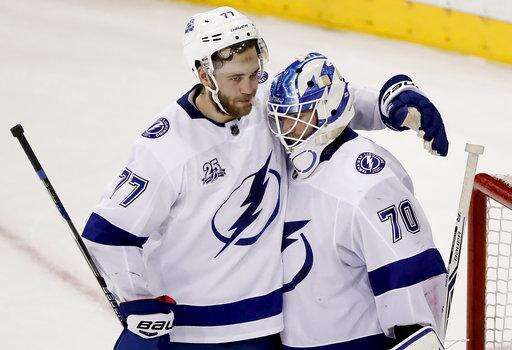 Tampa Bay Lightning defenseman Victor Hedman (77) celebrates with goaltender Louis Domingue (70) after the Lightning beat the New York Rangers in an NHL hockey game, Friday, March 30, 2018, in New York. (AP Photo/Julie Jacobson) The Associated Press