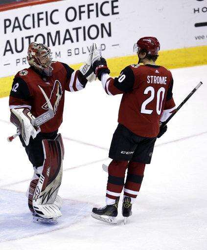 Arizona Coyotes goaltender Antti Raanta (32) celebrates with Dylan Strome (20) after shutting out the St. Louis Blues 5-0 during an NHL hockey game, Saturday, March 31, 2018, in Glendale, Ariz. (AP Photo/Rick Scuteri) The Associated Press