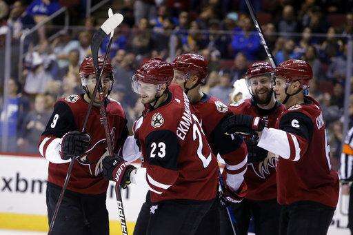 Arizona Coyotes defenseman Oliver Ekman-Larsson (23) celebrates with teammates after scoring in the second period during an NHL hockey game against the St. Louis Blues, Saturday, March 31, 2018, in Glendale, Ariz. (AP Photo/Rick Scuteri) The Associated Press