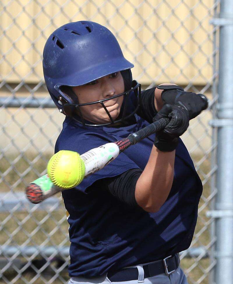 Round Lake batter Sydney Verastegui hits the ball during the girls high school softball game Wednesday against Alden-Hebron in Round Lake.