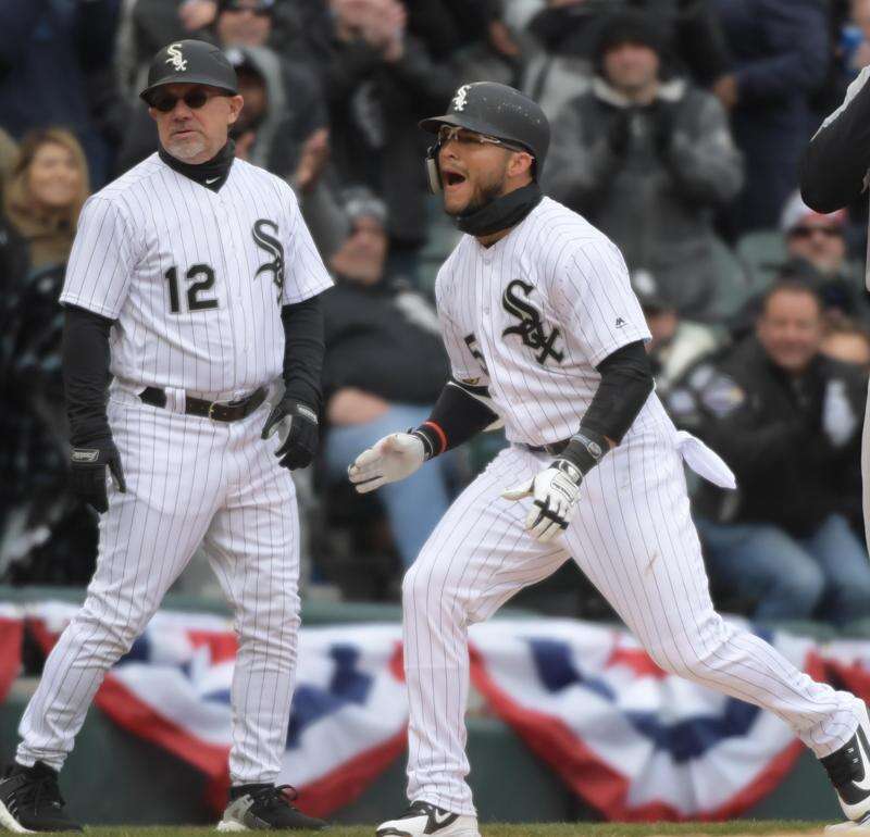 Chicago White Sox hitter Yolmer Sanchez reacts a third base after his 2-RBI triple in the first inning.
