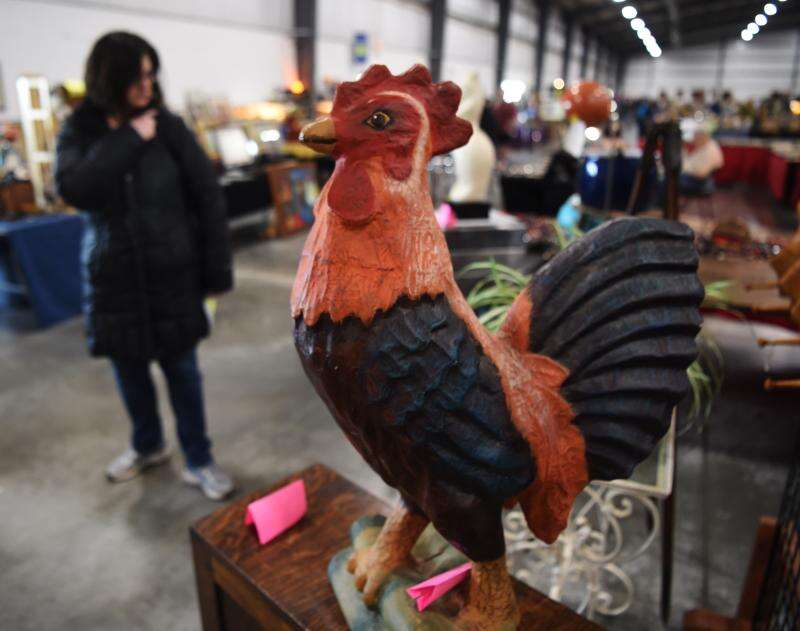 A papier-mâché rooster being sold by Jim Hodge of Elgin is displayed Sunday during the Zurko Antique and Flea Market at the Lake County Fairgrounds in Grayslake. Joe Lewnard/jlewnard@dailyherald.com