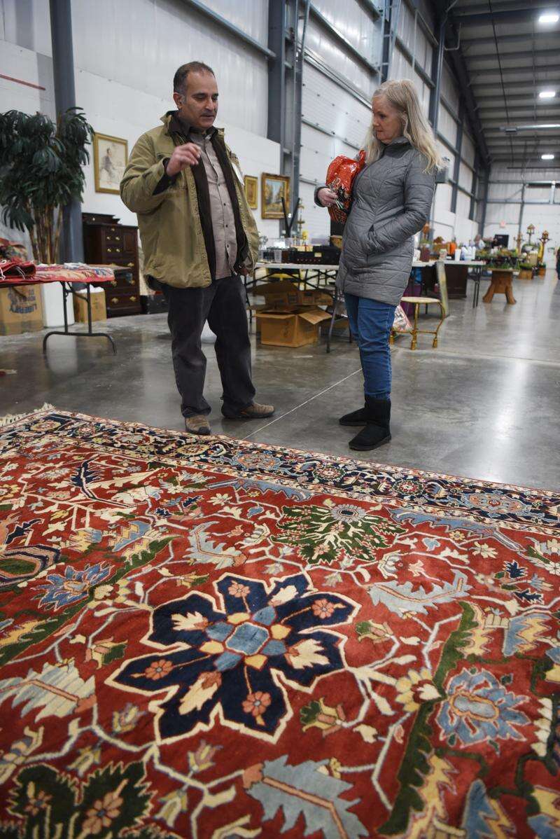Ben Khodadad of Cary shows a rug to Debbie Vanderborg of Grayslake on Sunday during the Zurko Antique and Flea Market at the Lake County Fairgrounds in Grayslake. Joe Lewnard/jlewnard@dailyherald.com