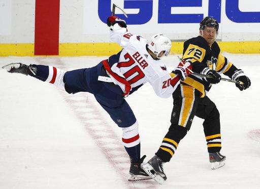 Pittsburgh Penguins' Patric Hornqvist (72) collides with Washington Capitals' Lars Eller (20) in the first period of an NHL hockey game in Pittsburgh, Sunday, April 1, 2018. (AP Photo/Gene J. Puskar) The Associated Press