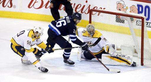 Nashville Predators' Roman Josi (59) tries to stop Winnipeg Jets' Blake Wheeler (26) as he gets a scoring attempt on goaltender Juuse Saros (74) during the overtime period of NHL hockey action in Winnipeg, Manitoba, Sunday, March 25, 2018. (Trevor Hagan/The Canadian Press via AP) The Associated Press