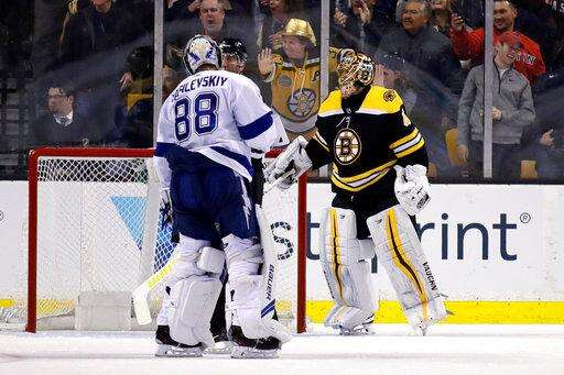 Tampa Bay Lightning goaltender Andrei Vasilevskiy (88) skates down ice toward Boston Bruins goaltender Tuukka Rask, right, as he is held back by an official after Rask was charged with roughing Tampa Bay Lightning center Cory Conacher during the second period of an NHL hockey game in Boston, Thursday, March 29, 2018. Vasilevskiy was charged with unsportsmanlike conduct. (AP Photo/Charles Krupa) The Associated Press