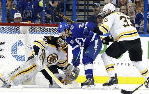 Tampa Bay Lightning center Brayden Point (21) tries to stuff the puck past Boston Bruins goaltender Tuukka Rask (40) as defenseman Zdeno Chara (33) looks on during the first period of an NHL hockey game Tuesday, April 3, 2018, in Tampa, Fla. (AP Photo/Chris O'Meara) The Associated Press