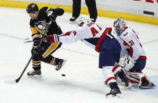 Pittsburgh Penguins' Patric Hornqvist (72) gets out of the way of a shot in front of Washington Capitals goaltender Philipp Grubauer (31) with Brooks Orpik (44) defending during the third period of an NHL hockey game in Pittsburgh, Sunday, April 1, 2018. The Capitals won 3-1. (AP Photo/Gene J. Puskar) The Associated Press