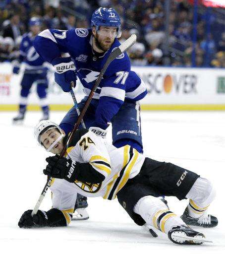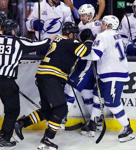 Boston Bruins right wing David Backes, left, pushes Tampa Bay Lightning center Cedric Paquette into the boards during the third period of an NHL hockey game in Boston, Thursday, March 29, 2018. At right is Lightning left wing Chris Kunitz. (AP Photo/Charles Krupa) The Associated Press