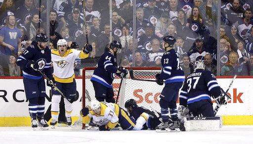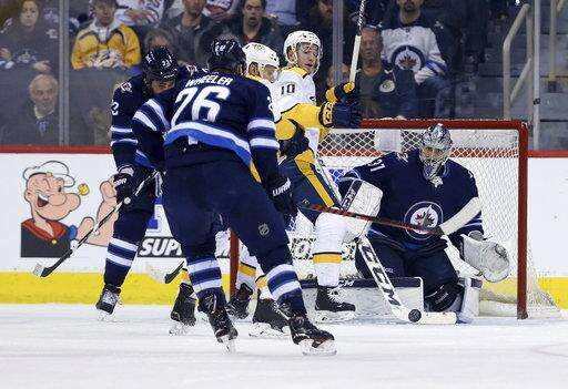 Nashville Predators' Viktor Arvidsson (33) celebrates on his knees after scoring on Winnipeg Jets' goaltender Connor Hellebuyck (37) during second period NHL hockey action in Winnipeg, Manitoba, Sunday, March 25, 2018. (Trevor Hagan/The Canadian Press via AP) The Associated Press