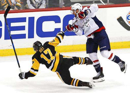 Washington Capitals' Tom Wilson, right, collides with Pittsburgh Penguins' Bryan Rust (17) during the third period of an NHL hockey game in Pittsburgh, Sunday, April 1, 2018. The Capitals won 3-1. (AP Photo/Gene J. Puskar) The Associated Press