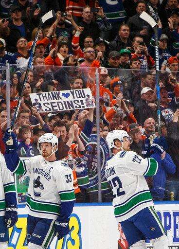 Vancouver Canucks' Henrik Sedin (33) and Daniel Sedin (22) acknowledge the crowd as they cheer for them during a break against the Edmonton Oilers in Edmonton, Alberta, Saturday, April 7, 2018. (Jason Franson/The Canadian Press via AP) The Associated Press