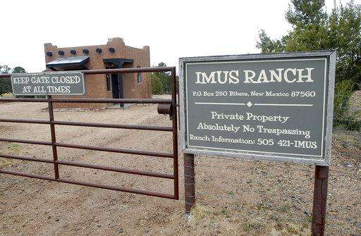 FILE - This April 12, 2017, file photo, shows the entrance to the Imus Ranch, owned by radio personality Don Imus, in Ribera, N.M. The sprawling cattle ranch in northern New Mexico is for sale, The Santa Fe New Mexico reports. The 2,400-acre ranch near the small community of Ribera, and about 45 miles east of Santa Fe, has been used to benefit children afflicted by cancer. (AP Photo/Jeff Geissler, File) The Associated Press