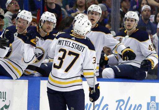 Buffalo Sabres center Casey Mittelstadt (37) celebrates with the bench after his goal against the Tampa Bay Lightning during the first period of an NHL hockey game Friday, April 6, 2018, in Tampa, Fla. (AP Photo/Chris O'Meara) The Associated Press