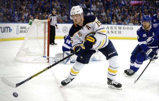 Buffalo Sabres center Jack Eichel (15) goes for the puck in front of Tampa Bay Lightning defenseman Anton Stralman (6) during the third period of an NHL hockey game Friday, April 6, 2018, in Tampa, Fla. (AP Photo/Chris O'Meara) The Associated Press