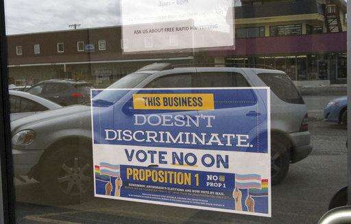 In this photo taken Monday, April 9, 2018, is a sign on a business door urging defeat of a proposition that would have rolled back protections for transgender residents in Anchorage, Alaska. Residents of Anchorage, Alaska’s largest city, became the first voters in the nation to reject a so-called bathroom bill at the ballot. (AP Photo/Mark Thiessen) The Associated Press