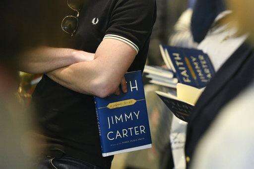 Patrons wait in line holding copies of a new book by former President Jimmy Carter as they wait for him to sign them Wednesday, April 11, 2018, in Atlanta. The book titled "Faith: A Journey For All" will debut at no. 7 on the New York Times best sellers list. (AP Photo/John Amis) The Associated Press