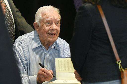 Former President Jimmy Carter signs copies of his new book "Faith: A Journey For All" Wednesday, April 11, 2018, in Atlanta. (AP Photo/John Amis) The Associated Press