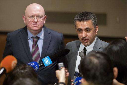 Russian Ambassador to the United Nations Vassily Nebenzia, left, and Bolivian Ambassador to the United Nations Sacha Llorenty speak to reporters in after Security Council consultations of the situation in Syria, Thursday, April 12, 2018, at United Nations headquarters. (AP Photo/Mary Altaffer) The Associated Press