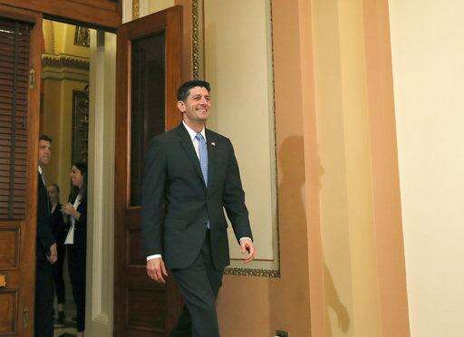 House Speaker Paul Ryan of Wis., arrives for a mock swearing-in ceremony for Democrat Conor Lamb of Pa., on Capitol Hill, Thursday, April 12, 2018 in Washington. (AP Photo/Alex Brandon)