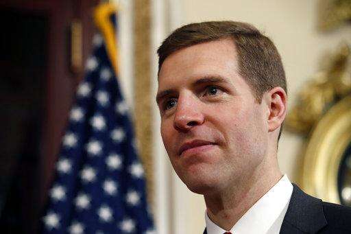 Democrat Conor Lamb of Pa., stands before his mock swearing-in ceremony on Capitol Hill, Thursday, April 12, 2018 in Washington. (AP Photo/Alex Brandon)
