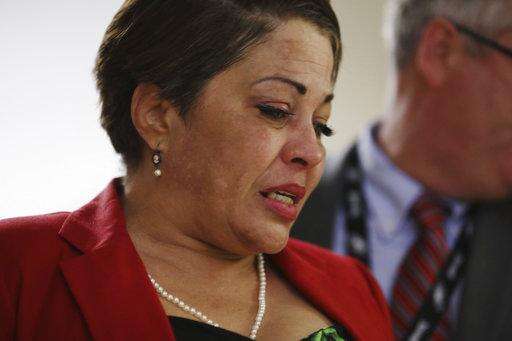 Chelan Lasha weeps as she returns to the courtroom after recess to testify against Bill Cosby during Cosby's sexual assault retrial at the Montgomery County Courthouse in Norristown, Pa., on Wednesday, April 11, 2018. (Dominick Reuter/Pool Photo via AP) The Associated Press