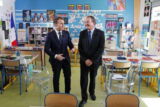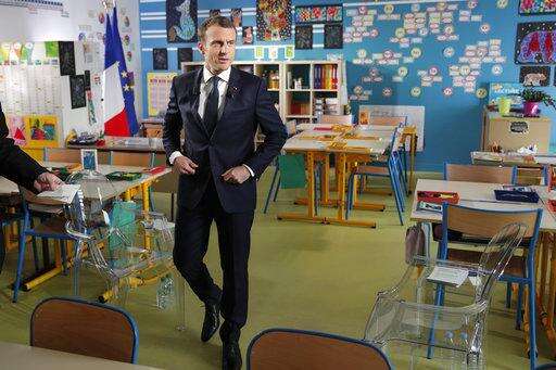 French President Emmanuel Macron walks in a classroom before a televised interview in Berd'huis, south of Paris, Thursday, April 12, 2018. Macron is appearing on national television Thursday to respond to the daily concerns of the French and defend his economic policies and tax changes, which he says are aimed at modernizing the country. (Yoan Valat, Pool via AP)