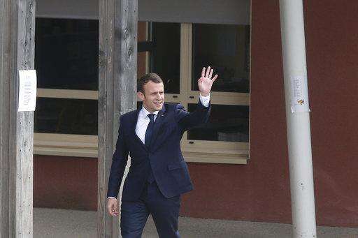 French President Emmanuel Macron waves as he arrives at school in Berd'huis, south of Paris, Thursday, April 12, 2018. Macron is appearing on national television Thursday to respond to the daily concerns of the French and defend his economic policies and tax changes, which he says are aimed at modernizing the country. (AP Photo/Thibault Camus)