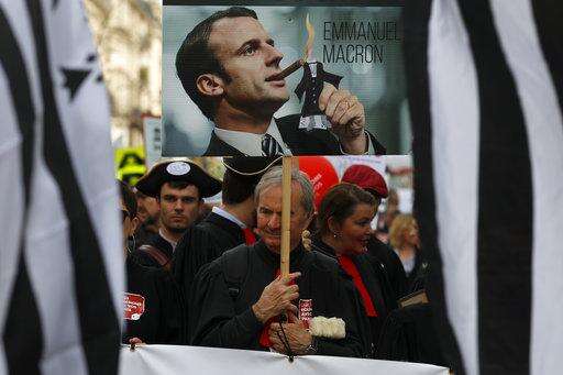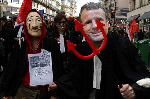 Lawyers and magistrates wearing a mask of French President Emmanuel Macron, at right, attend a demonstration as part of a nation wide day of protest against a government draft law on Justice, in Paris, Wednesday April 11, 2018. (AP Photo/Francois Mori)