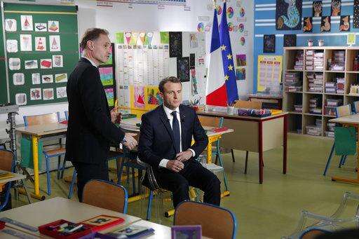 French President Emmanuel Macron, right, sits by French journalist Fabien Namias in a classroom in Berd'huis, south of Paris, Thursday, April 12, 2018. Macron is appearing on national television Thursday to respond to the daily concerns of the French and defend his economic policies and tax changes, which he says are aimed at modernizing the country. (Yoan Valat, Pool via AP)
