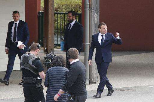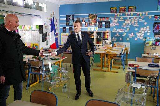 French President Emmanuel Macron, right, hands over documents to an aide as he arrives in a classroom in Berd'huis, south of Paris, Thursday, April 12, 2018. Macron is appearing on national television Thursday to respond to the daily concerns of the French and defend his economic policies and tax changes, which he says are aimed at modernizing the country. (AP Photo/Yoan Valat)