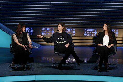 Italian actress and director Asia Argento, left, Laura Boldrini, center, and model Ambra Battilana Gutierrez, right, speak at the ninth annual Women in the World Summit Thursday, April 12, 2018, in New York. (AP Photo/Frank Franklin II)