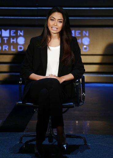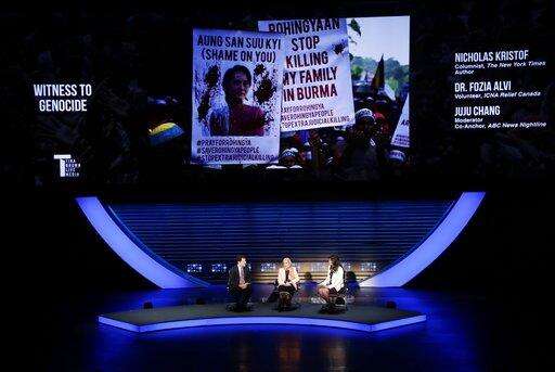 Nicholas Kristof, left, Dr. Fozia Alvi, center, respond to questions by Juju Chang as she moderates a discussion on the Rohingya people in Myanmar at the ninth annual Women in the World Summit Thursday, April 12, 2018, in New York. (AP Photo/Frank Franklin II)