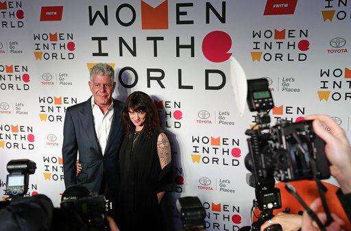 Anthony Bourdain, left, poses for photographs with Italian actress and director Asia Argento, right, at the ninth annual Women in the World Summit Thursday, April 12, 2018, in New York. (AP Photo/Frank Franklin II)
