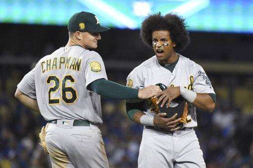 The A's sent nine batters to the plate in the fourth inning and scored five runs to lead 7-1. Marcus Semien had a two-run double during the rally, and Chapman and starting pitcher Daniel Mengden each had an RBI single.