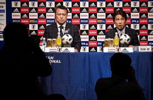 Japan Football Association (JFA) new coach Akira Nishino, right, speaks with JFA President Kozo Tashima during a press conference at its headquarters in Tokyo, Thursday, April 12, 2018. Japan fired coach Vahid Halilhodzic on Monday, two months before the World Cup, and immediately replaced him with Nishino. (AP Photo/Shizuo Kambayashi) The Associated Press