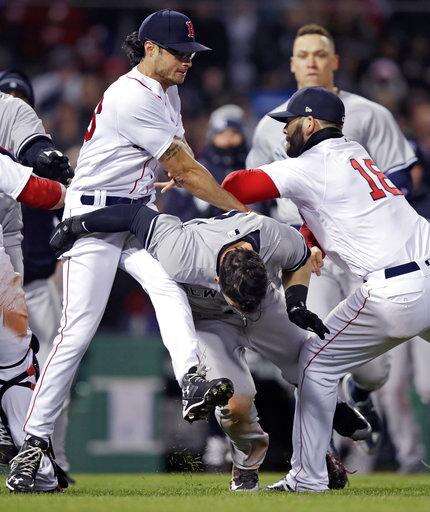 Boston Red Sox relief pitcher Joe Kelly, left, knocks down New York Yankees' Tyler Austin as they fight during the seventh inning of a baseball game at Fenway Park in Boston, Wednesday, April 11, 2018. At right is Red Sox first baseman Mitch Moreland. (AP Photo/Charles Krupa) The Associated Press