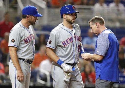 New York Mets' Kevin Plawecki, center, has his hand looked at after being hit by a pitch by Miami Marlins relief pitcher Tayron Guerrero during the eighth inning of a baseball game, Wednesday, April 11, 2018, in Miami. The Mets won 4-1. At left is New York Mets manager Mickey Callaway. (AP Photo/Lynne Sladky) The Associated Press