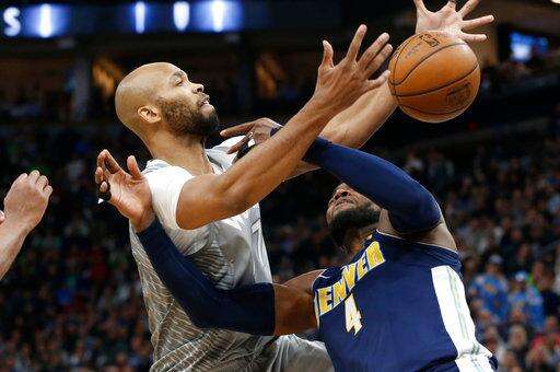 Minnesota Timberwolves' Taj Gibson, left, knocks the ball loose from Denver Nuggets' Paul Millsap during the second half of an NBA basketball game Wednesday, April 11, 2018, in Minneapolis. The Timberwolves won 112-106 in overtime. (AP Photo/Jim Mone) The Associated Press